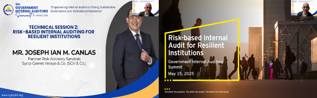 The summit featured a series of technical sessions addressing pivotal topics. Technical Session 1, led by Ms. Liezl F. Entrata-Pangan of the Philippine Guarantee Corporation, focused on strengthening internal audit’s role in enhancing public sector accountability through frameworks that promote transparency and ethical governance. Technical Session 2 was delivered by Mr. Joseph Ian M. Canlas, Partner, Risk Advisory Services, SGV & Co., who highlighted risk-based auditing approaches to fortify institutional resilience and adaptability during crises.